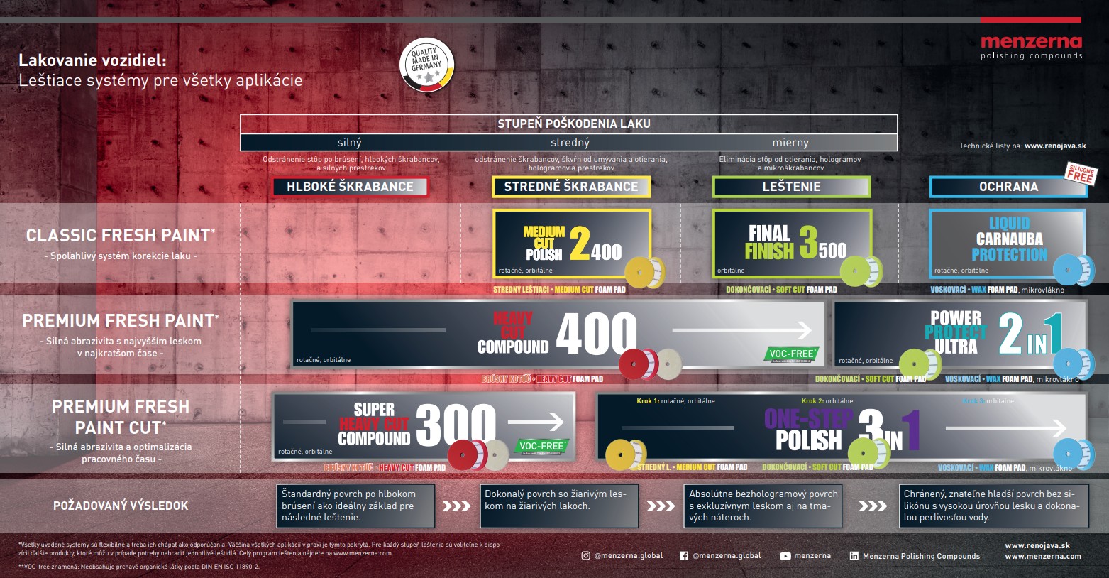 | Brúsne pasty Menzerna spoľahlivo, rýchlo a dôkladne odstraňujú hlboké škrabance, poprach zo striekania a silné známky používania. Ideálne sú aj po brúsení. |